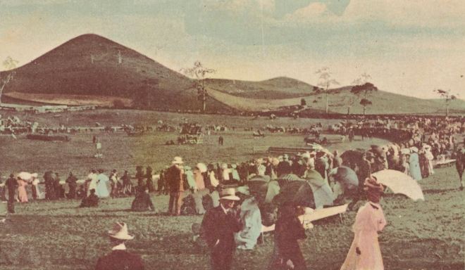 …for situation and the beauty of its surrounding, the Camperdown showground is unequalled in the colony. In its natural state, it is a beautiful spot, with the green slopes of Mount Leura and its more stately companion. Sugarloaf, rising up immediately behind it; whilst northwards is the township, looking prettier in the distance with its grass clothed streets, and its incomparable avenue of trees now almost in their complete spring attire: beyond the town, Lake Culongulac from the shores of which spread away to Mount Elephant and other distant hills, the verdure-clad plains. (Camperdown Chronicle, 25 October 1884 )