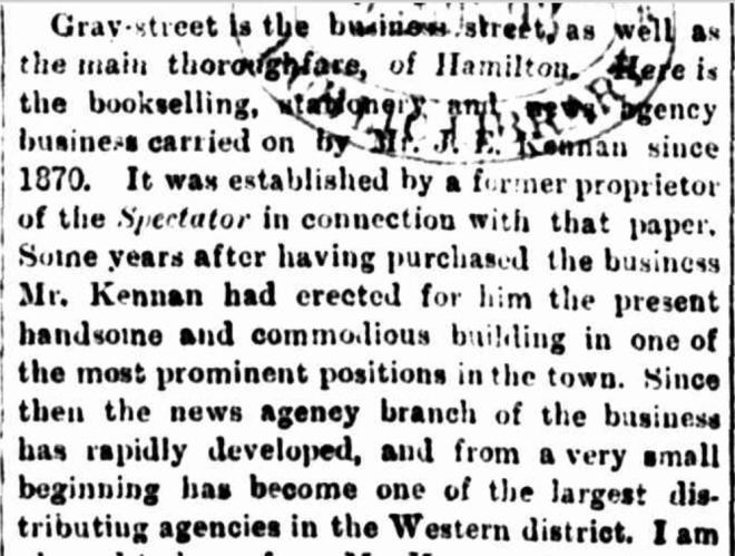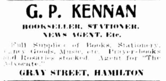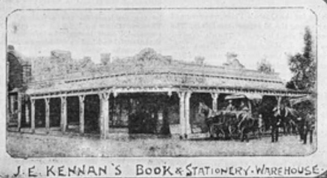 KENNAN, John Edward – Died November 1917 at Hamilton. John Kennan was born in Dublin in 1841 and arrived in Victoria in December 1855. He headed to Ballarat where he remained for several years and spent time in Melbourne and Bendigo. By 1865, he was in Kyneton, where he married Jane Cameron Campbell on 21 August 1867, and they raised a large family. Their first child was born in Richmond in 1870, the year John arrived in Hamilton after buying George Robinson’s stationery shop. At the time, George was the owner of the Hamilton Spectator. The family took up residence in French Street.