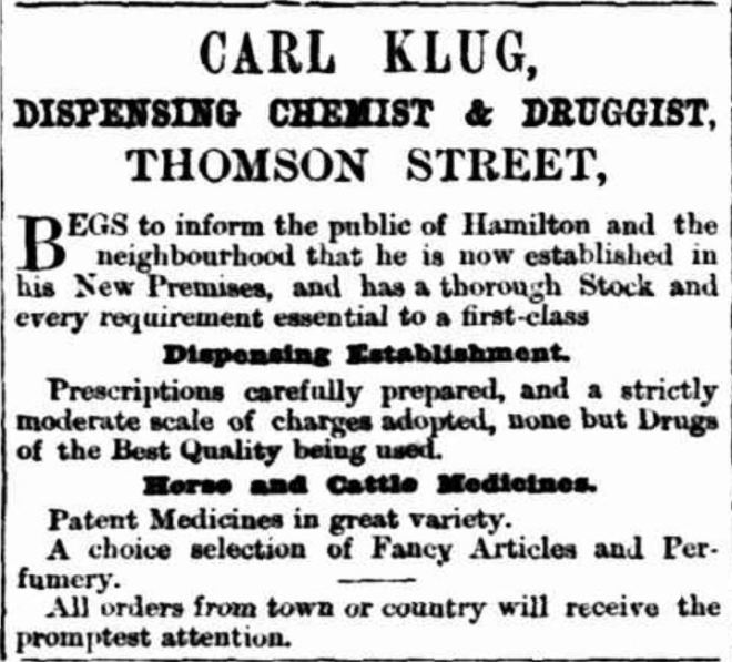 KLUG, Carl – Died 5 November 1897 at Hamilton. Carl Klug was born in Bromberg, Prussia (now Poland) around 1827. Following the careers of his father and older brother, Carl went to the University of Berlin to study as a chemist. As a Prussian citizen, he had to serve time with the Prussian army. It was thought he served with another Hamilton pioneer we met in the last Passing of the Pioneers post, Sigismund Jacoby.