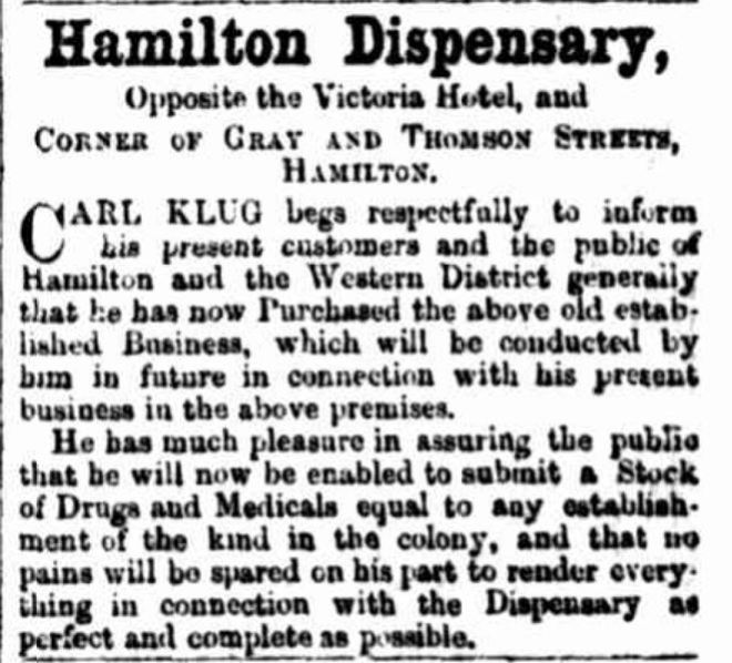 Sometime after his military service, Carl travelled to Victoria. He arrived in Hamilton around 1864 and opened a shop in Thompson Street.