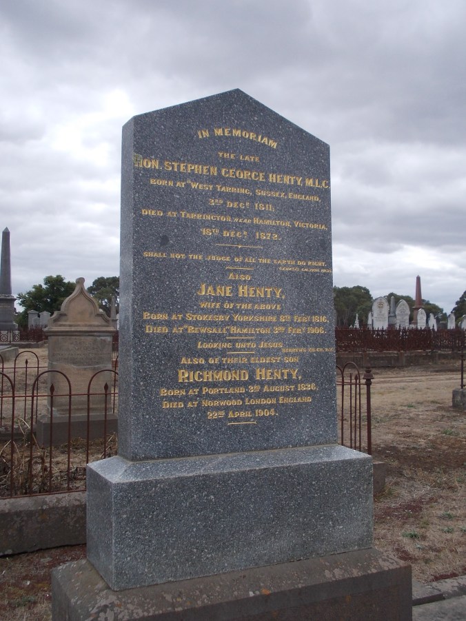 Elected to the Legislative Council of Victoria in 1856, Stephen and Jane spent much of their time at Findon in Kew. During his time in Melbourne, Stephen became one of the first members of the Melbourne Club. He resigned his parliamentary seat in 1870 due to ill-health and he and Jane retired to Tarrington, a property just east of Hamilton where Stephen died two years later. Stephen Henty is buried at the Hamilton (Old) Cemetery with Jane who lived for a further thirty-four years.