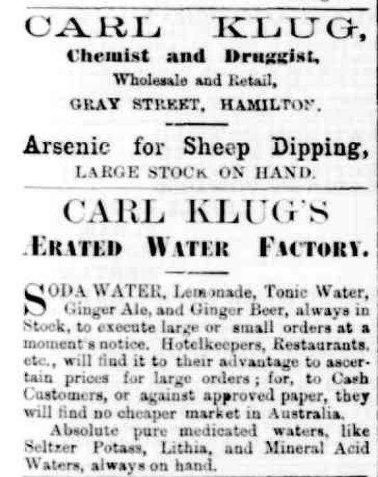 On 25 April 1868, Carl married Eveline Kruger at Warrnambool. They went on to have five daughters and one son. In 1877, Carl was a member of the founding committee of the Hamilton Gas Company. Earlier in that year, Carl opened the Hamilton Ice Works, the first of its kind in the Western District. It took great financial investment, with Carl having to buy the necessary machine followed by much trial and error to get it working. He advertised he was making ice twelve hours a day. Unfortunately, the business didn’t take off and Carl moved into producing aerated water. In his role as a chemist, he made and patented medicines. Placing his lemonade and ginger beer advertisement under his chemist advertisement for arsenic doesn’t seem like a good idea.