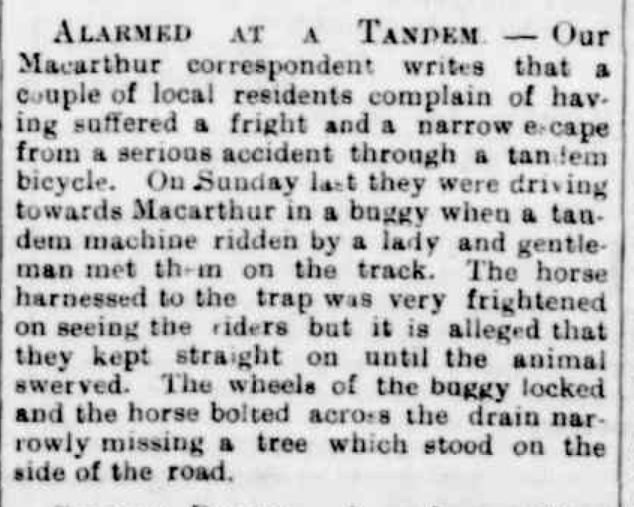 Although the bicycle was a quieter form of mechanisation, they were still mind-boggling for a horse, especially bicycles built for two as discovered near Macarthur in 1896: