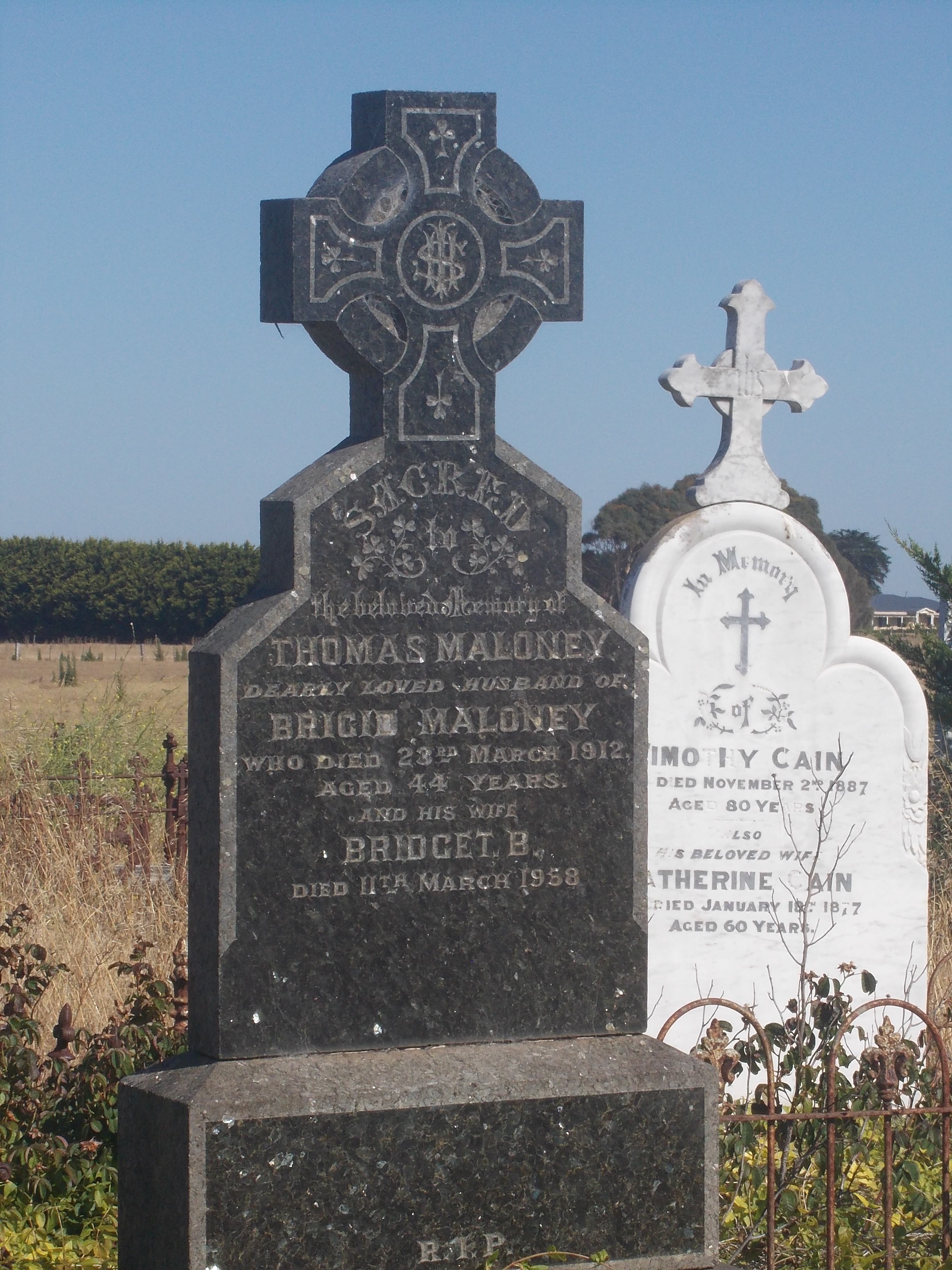Thomas and Catherine settled at Yambuk and went on to have fourteen children. Thomas Maloney was forty-eight when he died at Yambuk in 1891. At the time, there were still four children under the age of ten. Catherine stayed on at Yambuk before moving to James Street, Port Fairy around 1911 to live with her son Daniel. That is where she died in 1916, aged seventy-two. Catherine was buried at the Port Fairy Cemetery.