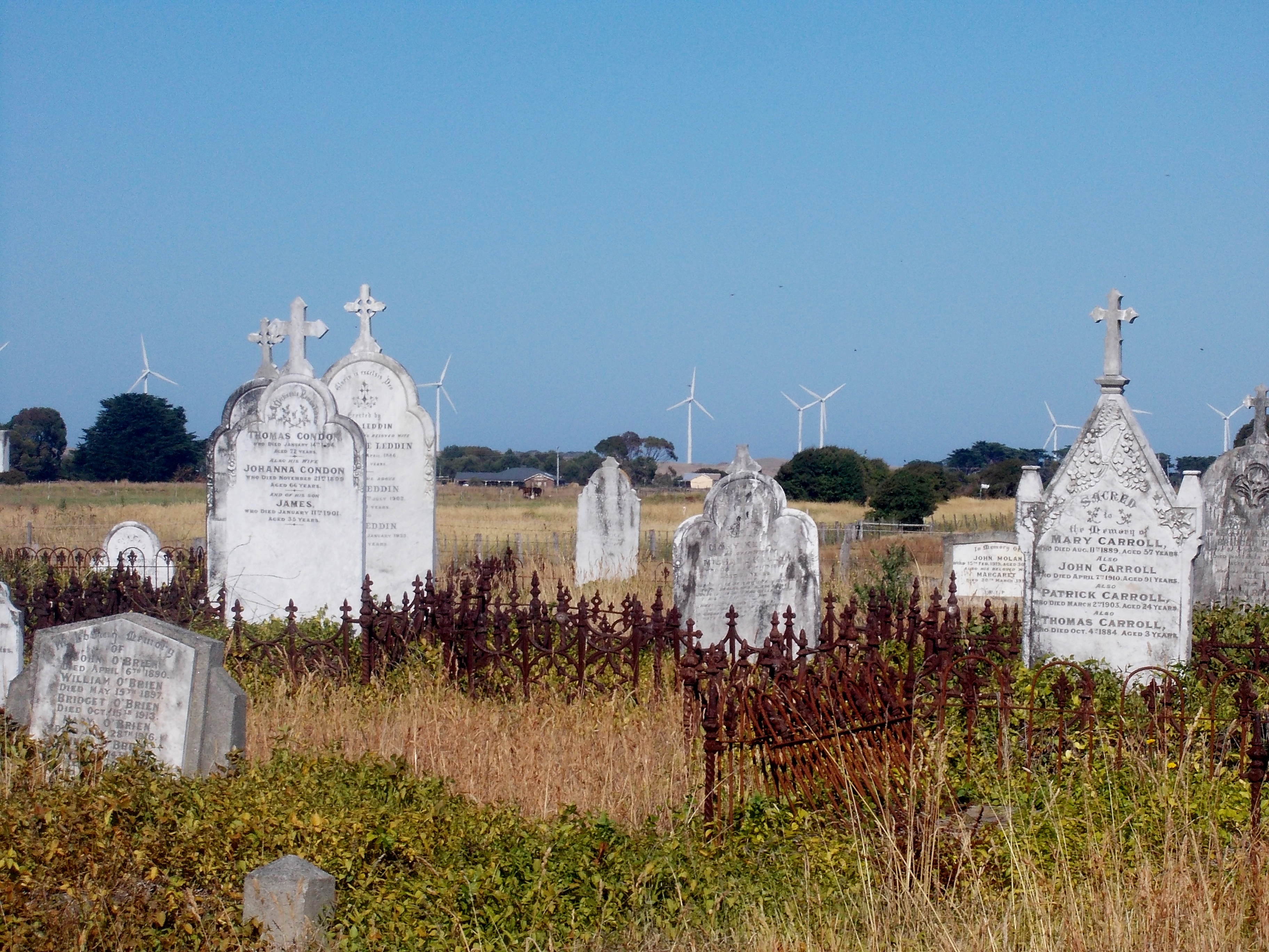The view of the turbines at the nearby Codrington Wind Farm with the headstones in the foreground contrasts the old with the new.