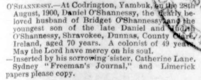 Just as with Catherine O’Shannessy, there were variations in the spelling of Daniel’s surname. His grave shows O’Shanassy, but his Victorian BDM’s Death index entry, Marriage entry and PROV Probate File show O’Shaughnessy. Considering Catherine’s (above) birth was registered as O’Shaughnessy we could probably assume O’Shaughnessy was the original spelling for both Daniel and Catherine.