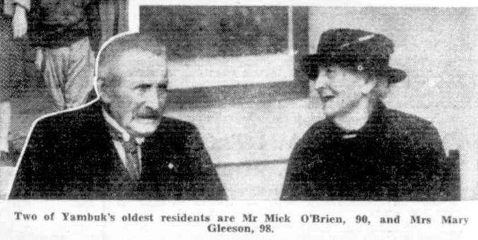 Michael and Mary had a daughter, Mary Eileen who was born in 1891 but died sixteen days later. A son Michael was born in 1902. Michael Gleeson Sr died in 1910. Mary lived in Fingerboard Road, Yambuk the same road as the cemetery. She died on 18 February 1951 at Warrnambool the age of 100. She was photographed in 1947 with another old resident of Yambuk, Michael O’Brien (below).