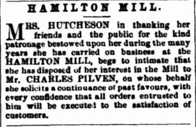 He was well read and held opinions in advance of his time. This, to some, made him appear somewhat eccentric, but those who knew him intimately were charmed with his conversation, and while admiring the man for his selfwill and robust turn of mind, they knew how soft a heart was covered by anapparently brusque exterior, and that many a family have had their flour ground or a bag of flour sent to them when they most wanted It, and no charge made, When a disastrous bush-fire ruined half the people on the creek a few years ago, Mr Hutcheson was the first to move in getting up subscriptions in their aid, and we are justified in saying that when the committee left the distribution of the funds to him, all were satisfied. Mr Hutcheson was a very retiring man; he loved the hum of his mill more than the bustle of the town,…He was a fine mechanic and could make anything in wood or metal, the old Hamilton Mill remaining a monument of his skill in that direction. (Hamilton Spectator 30 March 1870 p. 2)