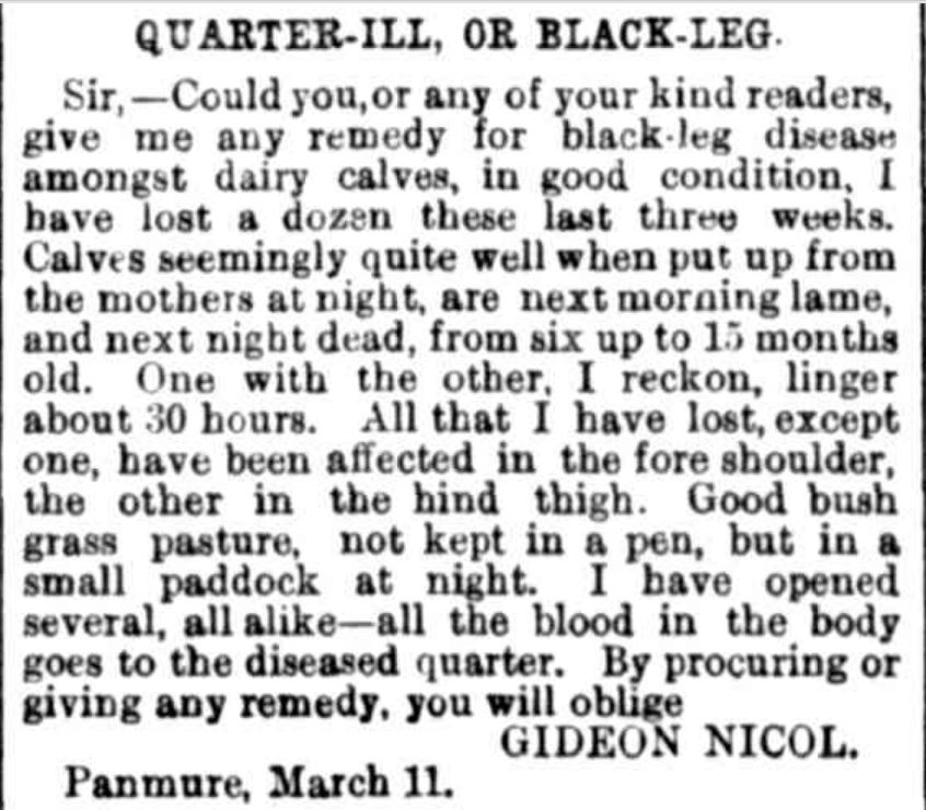 QUARTER-ILL, OR BLACK-LEG. (1871, March 18). The Australasian (Melbourne, Vic. : 1864 – 1946), p. 24. Retrieved May 25, 2019, from http://nla.gov.au/nla.news-article138081853