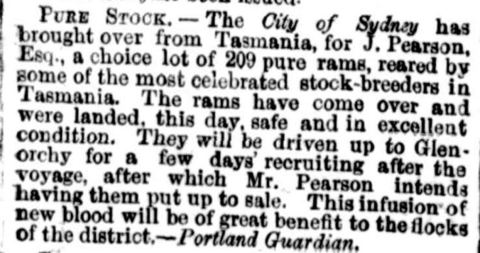 The Pearsons remained in Tasmania until 1846 when John sold Douglas Park and they travelled to Victoria aboard the Minerva captained by Captain Fawthrop on 30 May 1846. With them were servants and all their household furniture. On another ship John chartered, the Lady Mary Pelham were horses, cattle and farming implements. It took two weeks to make the trip to Portland Bay. Four nights were spent anchored at King Island due to rough weather. Since there was no pier at Portland at the time, the horses and cattle swam ashore and John’s family were carried through the surf to shore.