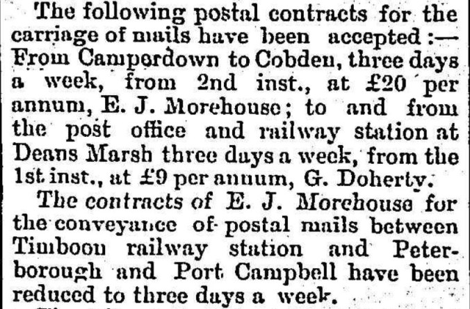 In doing so, she pioneered coach services between Cobden, Princetown, and Peterborough. She moved on to mail services as well. In 1885, she covered the Cobden to Camperdown run
