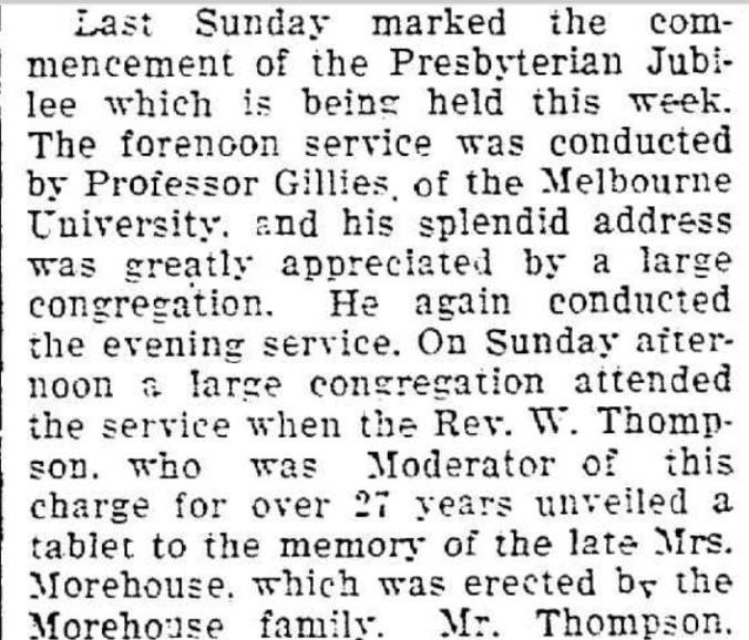 Eliza died the following year and was buried at the Cobden Cemetery. A memorial tablet was unveiled in her memory in 1935 at the Cobden Presbyterian Church.