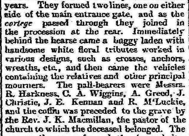 On 29 August 1900, Bessie contracted a cold, and inflammation to her lungs resulted. She rallied for a time, but things took a turn for the worse on 1 September and she died the following morning aged just thirty-two. She was remembered for her quiet, unassuming nature and her devotion and enthusiasm to her various voluntary endeavours. That admiration was evident with the large attendance at Bessie’s funeral. The pallbearers were made up of prominent townsmen including three past and future Hamilton Mayors.