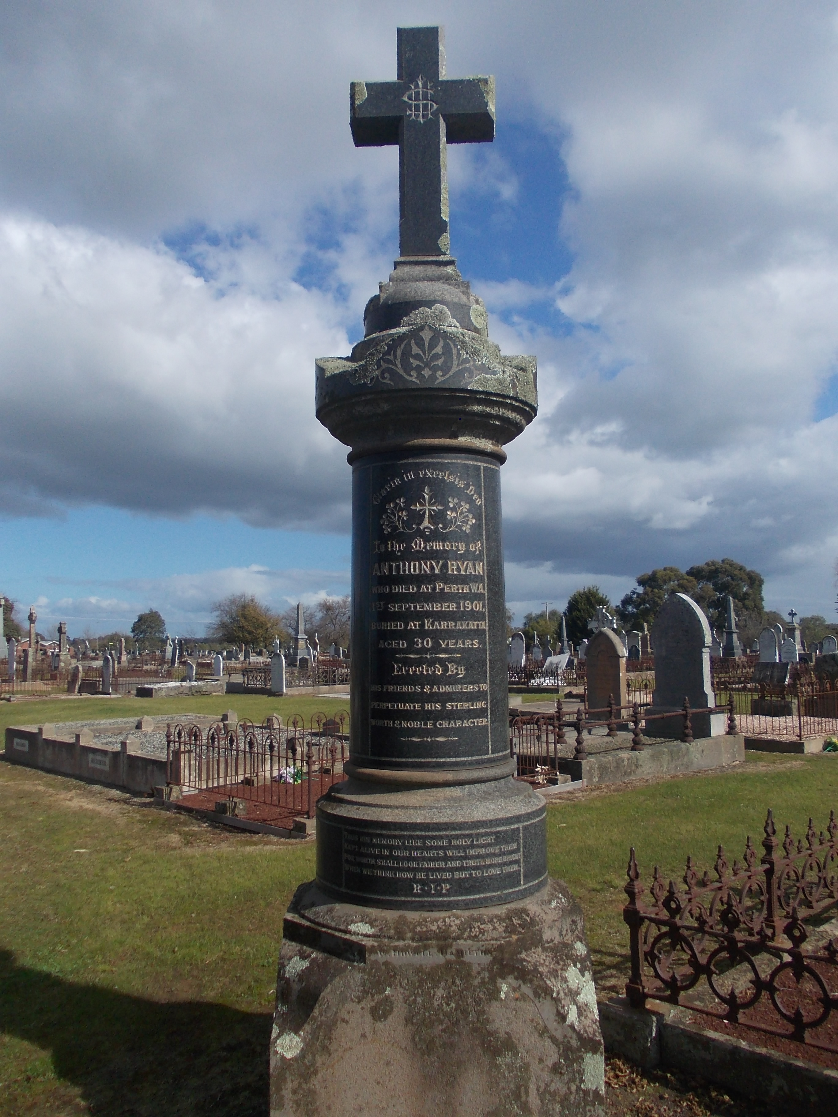RYAN, Anthony – Died 2 September 1901 at Perth. Anthony Ryan was born to Thomas Ryan and Margaret Witherow at Sebastopol in 1871. Thomas worked with Victoria Railway and with the opening up of the railways in the south-west in the late 1870s, the Ryans moved close to Hamilton. Thomas worked as the railway gatekeeper at Pierrepoint on the Penshurst line. Anthony, known to all as Tony, attended the Warrayure State School just east of Hamilton. He was a very bright student and his final marks saw him offered a scholarship to the Hamilton Academy to complete matriculation. While still a student, he was also helping as an assistant teacher, and on finishing his matriculation, he began teaching in his own right at the Academy.