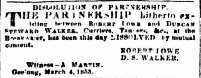 WALKER, Duncan Stewart – Died 29 September 1889 at Camperdown. Duncan Stewart was born around 1827 in Argyllshire, Scotland. After the death of his father, Duncan came to Australia with his mother, arriving at Geelong in 1841. Just thirteen Duncan gained employment at Kardinia on the Barwon River, the run of Dr Alexander Thomson remaining for ten years. He then went into partnership with Robert Lowe in a tanning and currier business on the Barwon River. It operated successfully until the river flooded in June 1852. The following year the partnership was dissolved.