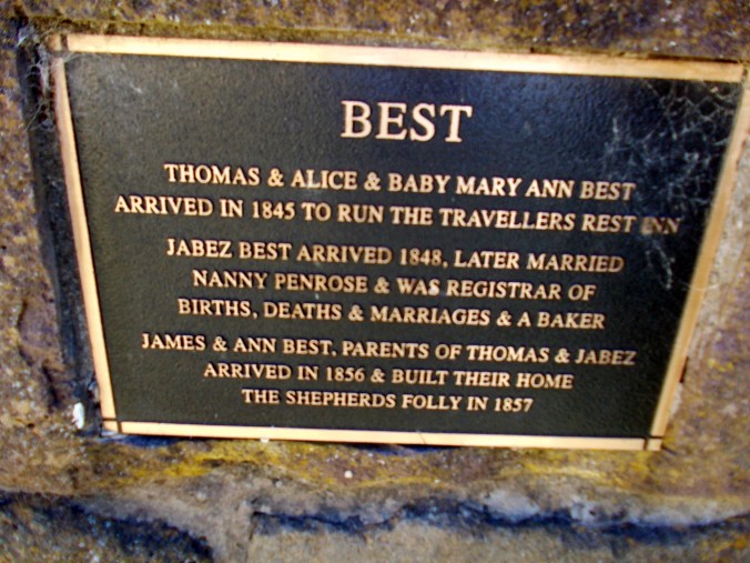 Jabez left his widow Nanny, two sons, and four daughters to mourn him. He was buried at the Branxholme Cemetery, The Best family are remembered on the Branxholme Pioneer Wall, below.