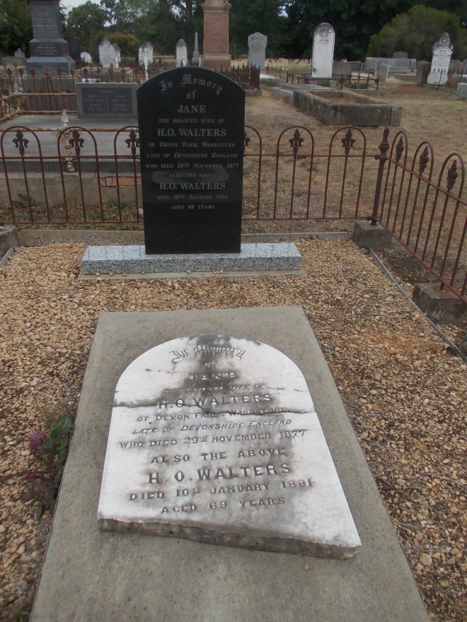 WALTERS, Hugh Oxenham – Died 10 January 1891 at Warrayure. Hugh Walter was born in England around 1821. He married Jane Walter in Devon in 1845, and they started their family. In 1853, they left England for Australia, settling in the Geelong district. Around the late 1860s, Hugh took up land at Warrayure, east of Hamilton. He named his property Devon Farm. There he bred high-quality long-wooled sheep and purebred poultry. Hugh’s wife Jane died in 1877, aged fifty-three. Hugh remarried to Mary Houston in 1879.