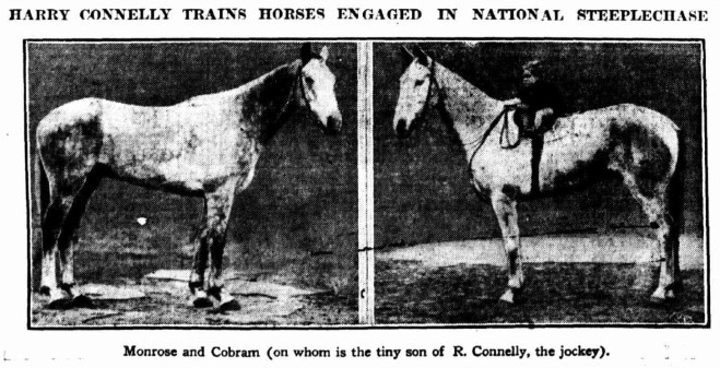 Harry married Agnes Lucas in 1890. Two of their sons followed Harry into the racing game, with Joseph and Robert becoming jockeys. They rode for Harry as Robert did in 1918 when he rode Cobram, owned and trained by Harry, to a win in the Grand National Steeplechase. Henry’s grandson was photographed on the horse after the win.