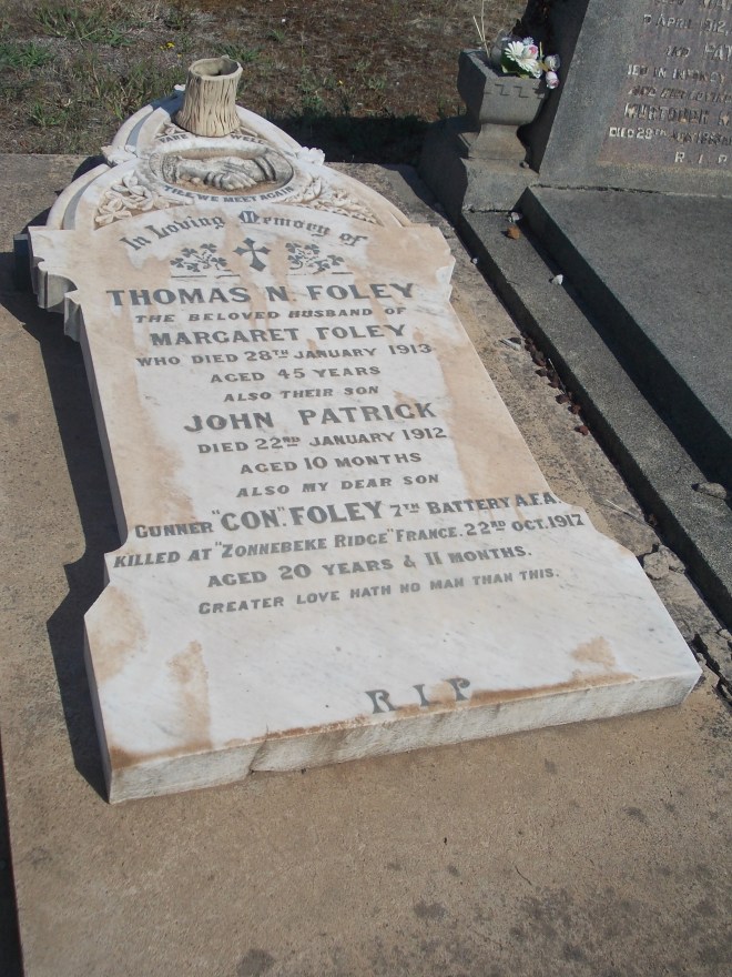 In 1917, Thomas and Margaret’s son Cornelius, was killed in Belgium. A memorial to him was added to the Foley headstone at the Hamilton (Old) Cemetery (below).