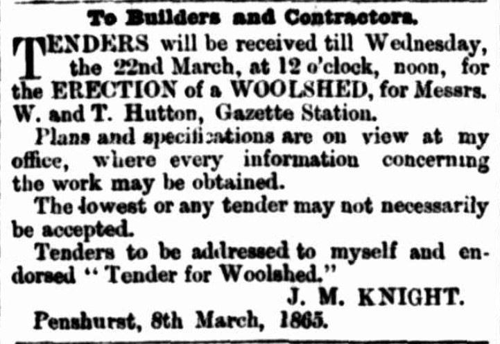 On finishing school, Thomas went to Port Fairy, where he is older brother George was a general merchant. Thomas eventually went into partnership with him. He was still taking an interest in farming at Penshurst in partnership with his brother William in the property Gazette station. During that time, Thomas and William built a woolshed on the property, still in use today. William died in 1869.