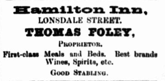 FOLEY, Thomas Nicholas – Died 28 January 1913 at Hamilton. Thomas Foley was born at Coleraine in 1867. His father, Cornelius, was the manager at the nearby Mt Koroite station, something he would do for thirty-five years. In 1891, Thomas married Margaret Maria O’Hagan, and they settled at Coleraine and started a family. They were living on the Cavendish Road, and Thomas was breeding and showing pigs. In 1903, Thomas took up the freehold and license of the Hamilton Inn in Lonsdale Street, Hamilton, from Mary Meagher.