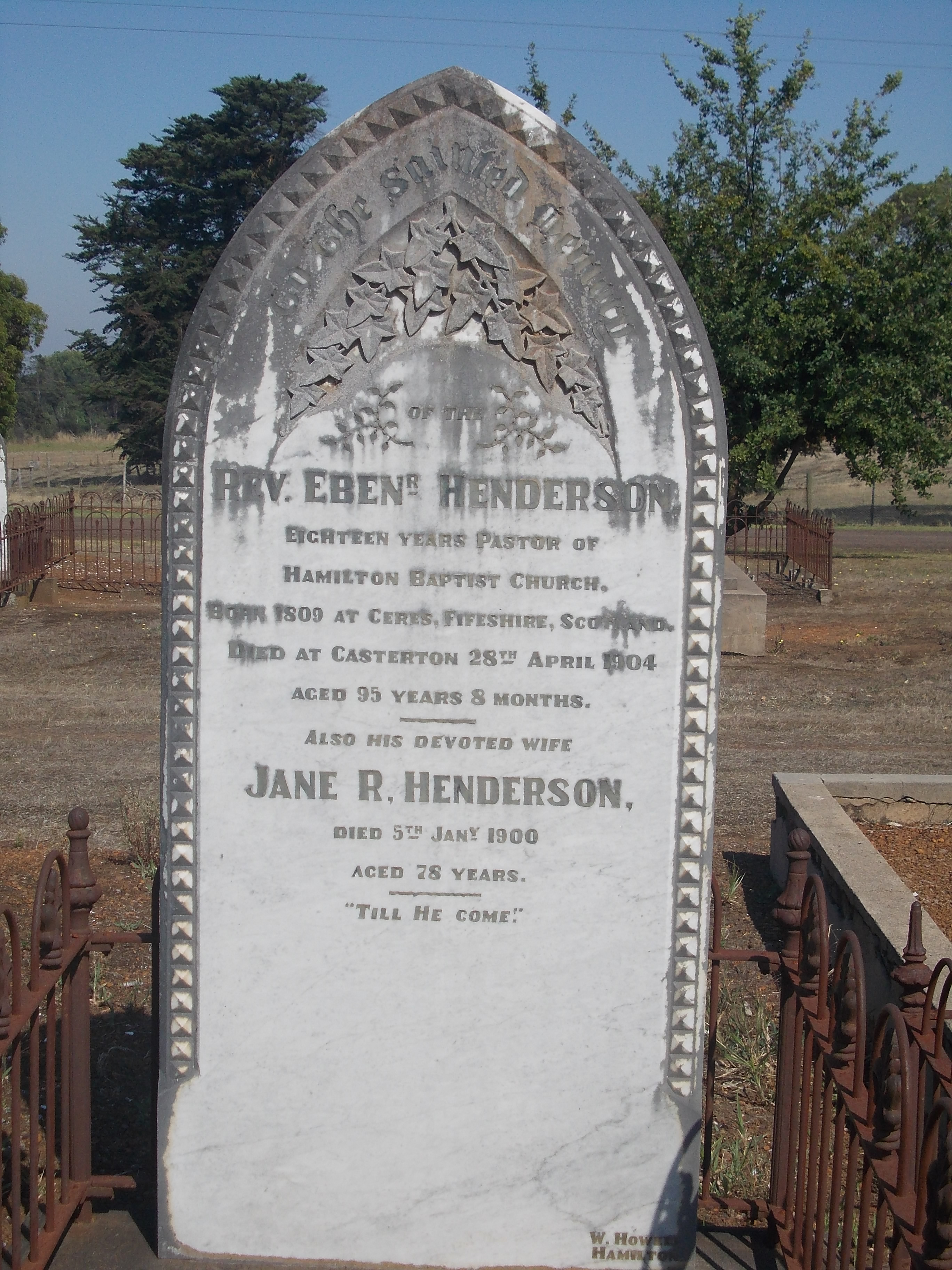 Ebenezer died in 1904 at Casterton, the oldest Baptist pastor in Australia. In 1918, the Hamilton Baptist Church unveiled a memorial pulpit dedicated to Ebenezer. Jane was remembered. She “was well-beloved, and it was due to her loving care that he (Rev. Henderson) was so long spared. She helped all who were in sorrow.”