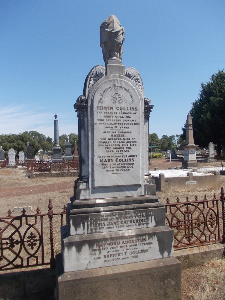 POOK, Mary – Died 24 September 1906 at Dunkeld. Mary Pook was born around 1830 in Brixton, England. She married Edwin Collins at Brixton in 1852. The obituary of Mary’s daughter, Jane Collins, says Mary and Jane arrived at Portland around 1858 aboard the Great Britain. They were to meet her husband Edwin, who had travelled ahead and was at Hamilton. It must be noted the Great Britain arrived in Victoria to Hobsons Bay with immigrants in 1857 and 1859 but not Portland. I also haven’t found Mary or Jane on the passenger lists.