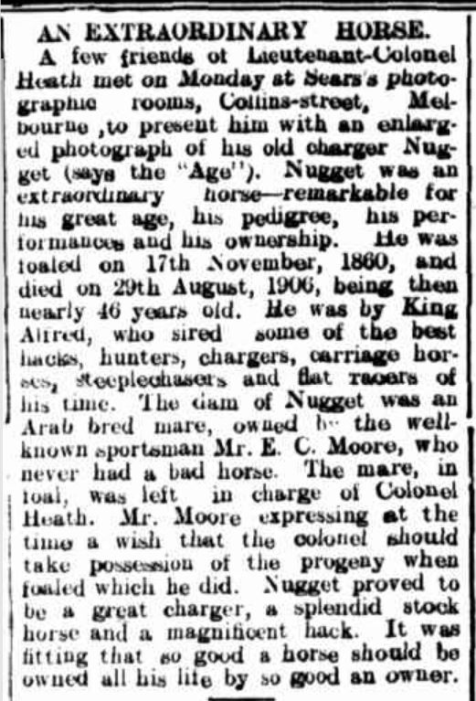 King Alfred died in 1873, and news of his death reverberated around the country. His most famous offspring was the mare Mermaid, who won the 1871 Sydney Gold Cup for Edward Twomey of Penshurst. And then there was Nugget.