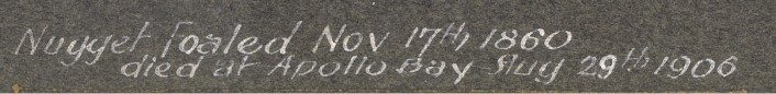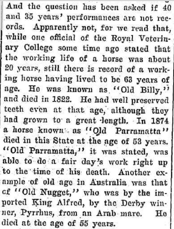 I also noticed Nugget’s age at his death was forty-six, way past the average life expectancy of a horse and placing him among the oldest horses to have lived in Australia.