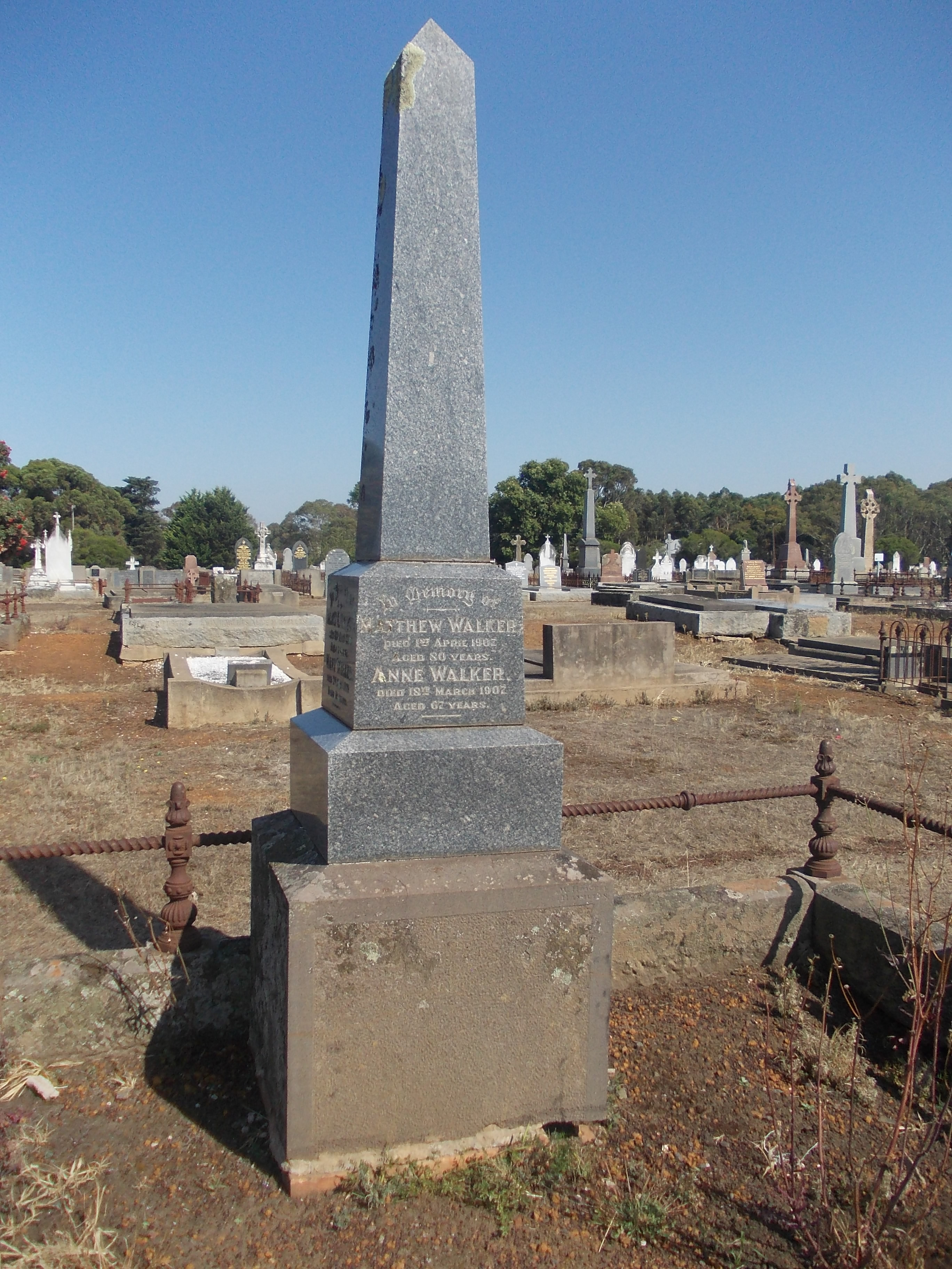 WALKER, Matthew – Died 2 April 1907 at Hamilton. Matthew Walker was born in Hamilton, Scotland, around 1828. In the early 1850s, a group of residents near Matthew’s home purchased a ship, intending to sail to Australia. All adults wishing to sail bought a share in the ship, the Sophia Burbidge.