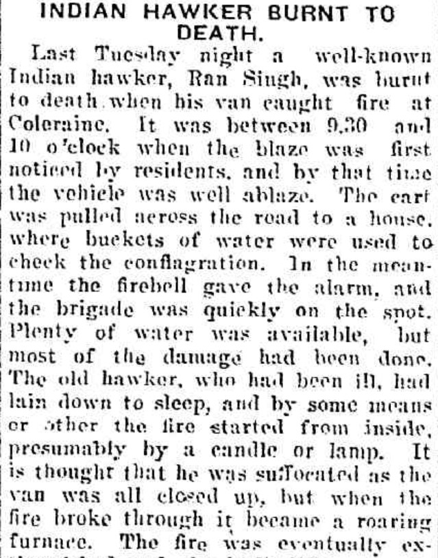 In 1902, Ran again received a license to hawk on foot. It seems he then moved to the west of Hamilton. In 1914, Ran was among the gift givers for the marriage of John Quigley and Evelyn King at Merino. In December 1915, Ran and fellow hawkers, including Lucca Singh, donated to the Casterton Hospital after paying for their licenses at Casterton.