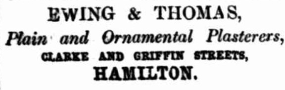 EWING, James-Died 9 January 1892 at Hamilton. James Ewing was born in Peterhead, Scotland, in 1809. He and his wife, Jane Pirie, arrived in Victoria in the early 1850s and in Hamilton by 1860. James was a plasterer by trade. He was initially in business with John Thomas, then later went out on his own.