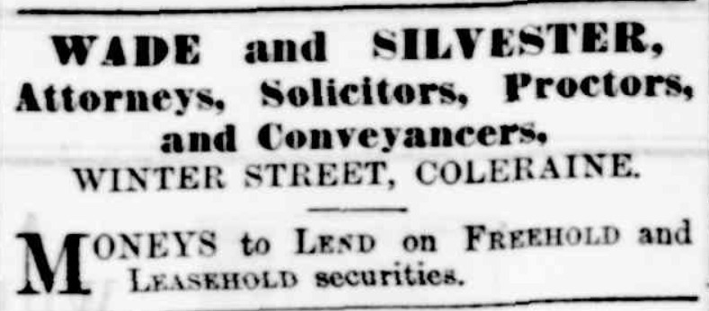 The death of Coleraine solicitor Arthur Wade in March 1881 left an opening for a solicitor in the town and in 1882 Eugene opened his own practice in the town, keeping the name of his predecessor in the business name Wade and Silvester.