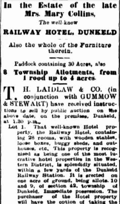 On 28 May 1855, Mary Ellen died at Portland aged just thirty. In the months after, Thomas and the children went to live at Merino Waterholes, now Merino, where he set up an auctioneering business known as the Merino Auction Mart.