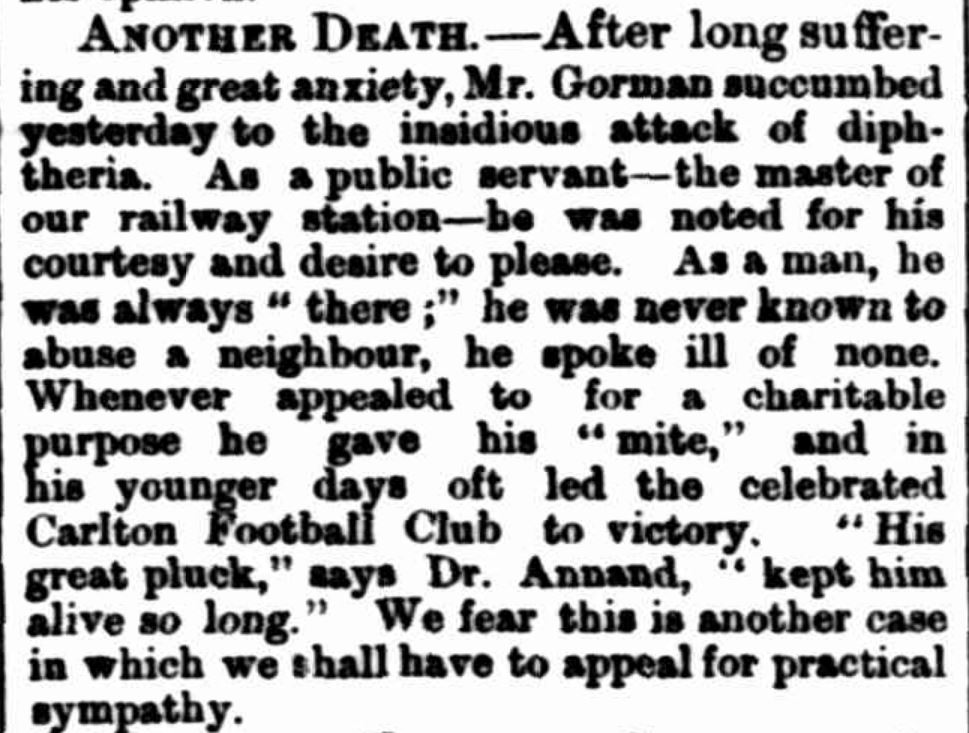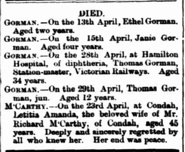 …no doubt this case is one of the most pitiable that ever occurred in this district…two of his children were struck down by diphtheria. In attending upon them Mr. Gorman caught the disease…every attention was paid to him, but without effect. One by one he saw his children die, and finally, his great courage alone having kept him alive, he followed the two little ones, and another of his children died yesterday.