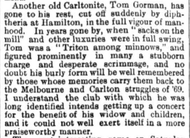 No doubt Alice, Margaret, Frank, and Edith thought often of those they left behind in Hamilton in April 1880. In football circles for years to come when old-timers remembered back to the players in the early days of the Carlton Football Club, the name of Tom Gorman and that of his brother William were among those raised.