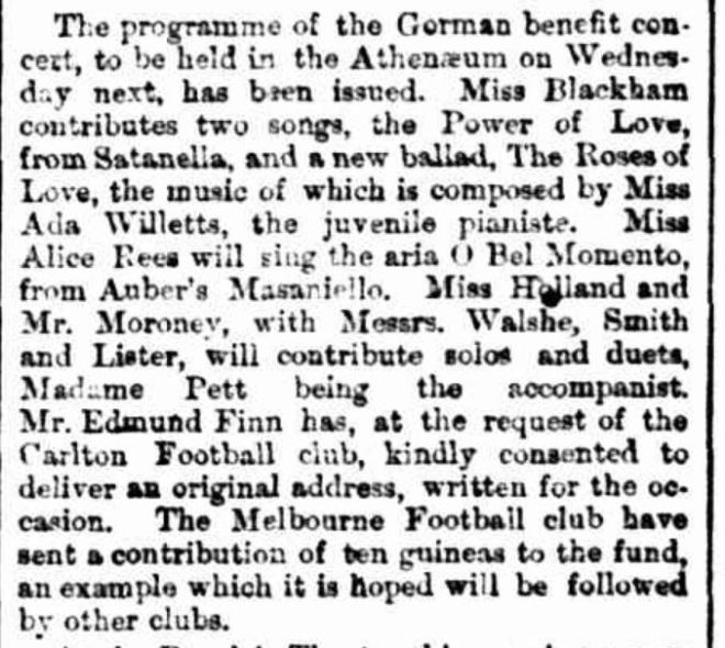 Meanwhile, plans were well underway for a fundraising concert for the Gorman family. It was planned for the Athenaeum Theatre in Collins Street, Melbourne on 27 May under the patronage of the Victorian Football Association, the Carlton and Melbourne Football Clubs, and the Metropolitan Rifle Corps.