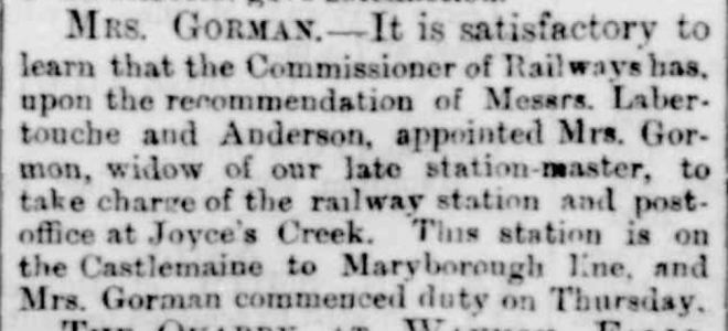Alice recovered and by the end of the year was appointed to take over the station and post office at Joyce’s Creek between Maryborough and Castlemaine.