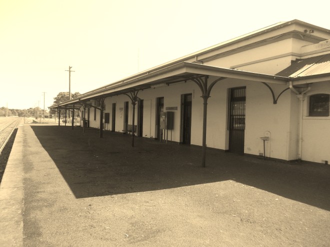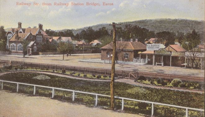 The Euroa Railway Station was just across the road from the National Bank, as seen in the view below, looking from the station. The original National Bank is the single-storey building on the right-hand corner. A new bank was built late and is seen on the opposite corner.