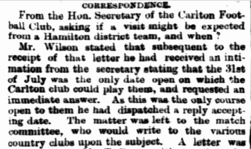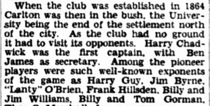 On 17 May 1865, a meeting was held at the University Hotel to elect office bearers for the Carlton Football Club. Ben James was elected secretary and his first duty was to write to James Linacre requesting he take on the role of President. It was decided to adopt the rules of the Melbourne Football Club. An intraclub scratch match was played a week later and on 27 May 1865, the Carlton Football Club wearing a uniform of orange, including an orange cap with a blue stripe took on Melbourne Grammar. One of the Gorman brothers was on the team.
