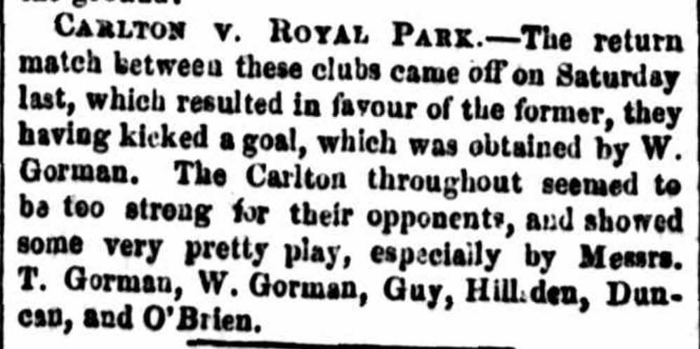 I was able to find six games played by the Gorman brothers in 1865 for Carlton. In four, T.Gorman and W.Gorman were both named, while in the other two games, only “Gorman” was given in the team list. Three of the matches were against the Warehouseman’s Club and the remainder were Melbourne Grammar, Royal Park, and Williamstown.