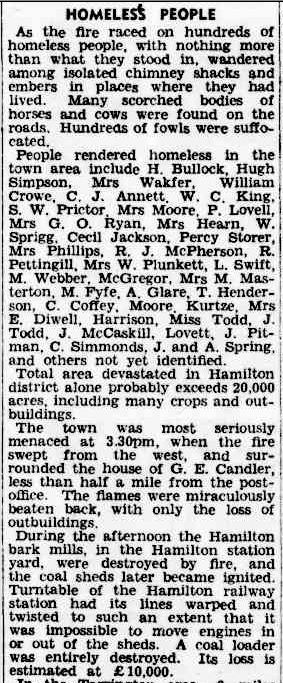 The Lovell’s house was around three kilometres from the main street, Gray Street.  The Argus reported the closest the fire got to Gray Street was just 500-800 metres from the Post Office.  Having lived in Hamilton, I find this unimaginable, particularly the thought of roofing iron blowing into the main street.