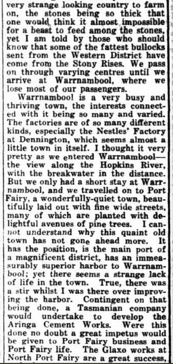 Of interest is the Glaxo works in Port Fairy, considered by “Mernda” as a “great success”.  Glaxo produced high quantities of milk powder, from milk sourced from the local area.  In the 1940s, the company name changed to Glaxo Laboratories and still exists today in Port Fairy as GlaxoSmithKline.
