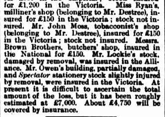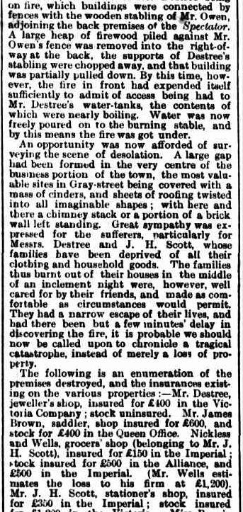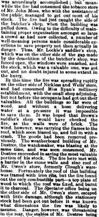The article gives an interesting insight into how a fire of such intensity was managed in the 19th century.  Many buildings were wooden and there was little or no water pressure.  An early decision to pull down the butcher shop of  Messrs. Brown Brothers to create a gap between the fire and the rest of the buildings in the block was to no avail as the fire was quickly spreading from the other side of Nickless and Wells.  Firefighting attempts were also hindered by the large crowd that had gathered.