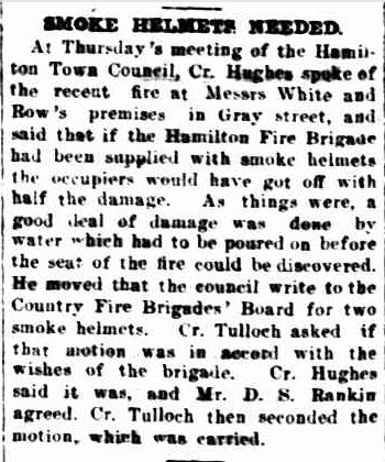 With the tendency for fires in the CBD, it was no surprise that after a fire in Gray Street in 1932,  Councillor Hughes thought smoke helmets could be of some use to the fire brigade.