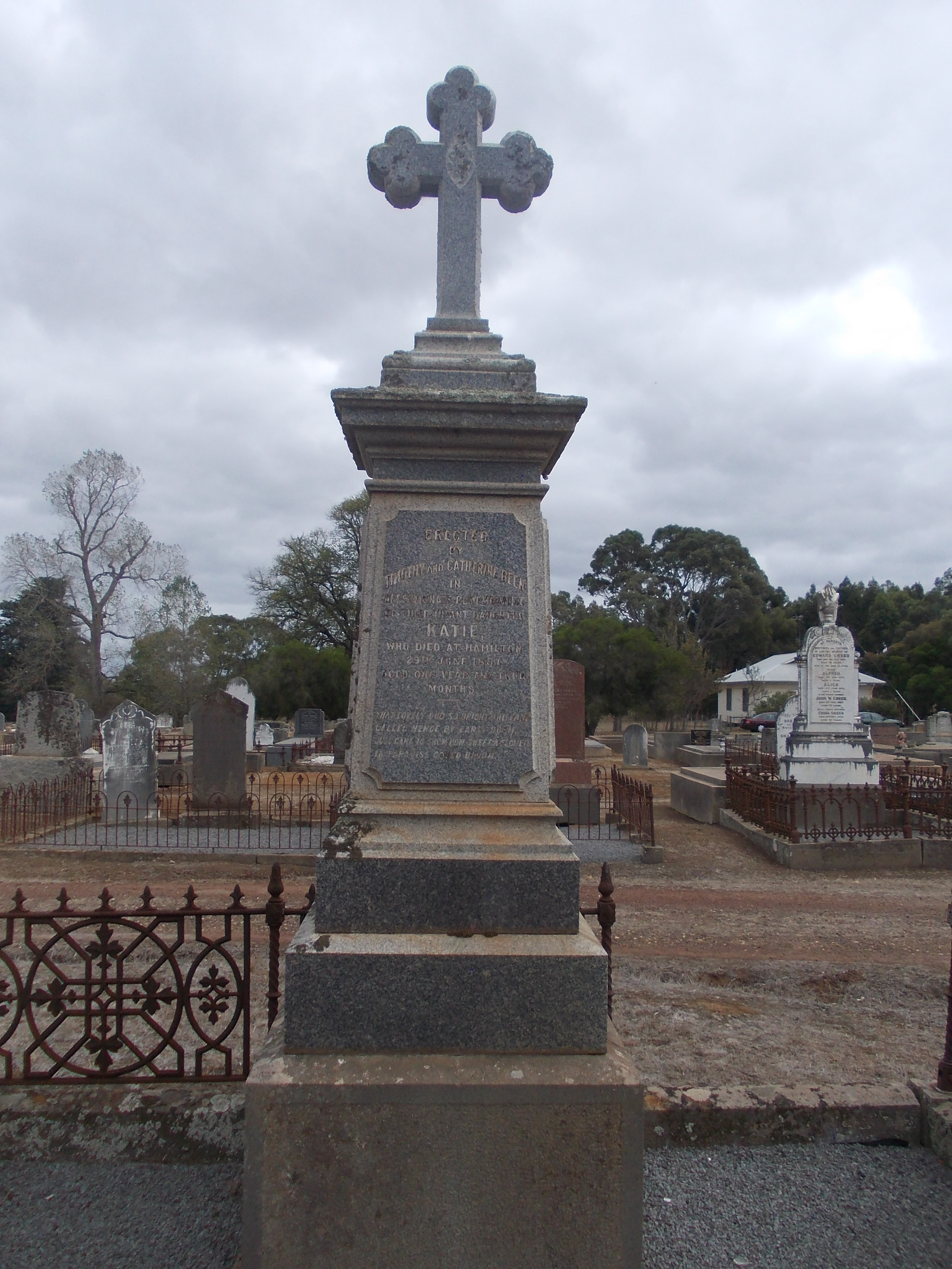 On 13 October, a large crowd of mourners gathered to follow Timothy’s remains along Lonsdale Street, Hamilton en route to the cemetery.   At 2.30 pm, thirty-four members of the Hibernian Society entered the church to join Monsignor Shanahan.  The coffin was lifted and carried out to the waiting hearse.  Monsignor Shanahan travelled to the cemetery in a carriage behind the hearse, followed by the Hibernian Society, the mourning coach with Catherine and two of the eldest children, then the councillors followed by around sixty more vehicles, thirty men on horseback and many on foot.  The procession stretched around two kilometres.