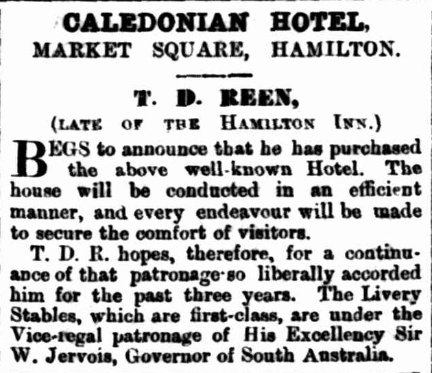 DEATH OF CR. REEN. (1892, October 13). Hamilton Spectator (Vic. : 1870 – 1918), p. 3.  http://nla.gov.au/nla.news-article225179741