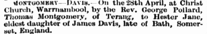 BEST, Jabez – Died 9 September 1903 at Branxholme. Born in Hastings, England around 1821, Jabez arrived in Tasmania with his parents in 1829. He remained there until 23 September 1843 when at the age of twenty-two, he boarded the Minerva and travelled to Portland Bay. His brother Thomas had arrived there a year earlier on 20 April 1842 also on the Minerva. Thomas had made his way to the area known then as Arrandoovong, later becoming Branxholme. and was running the Travellers Rest hotel.