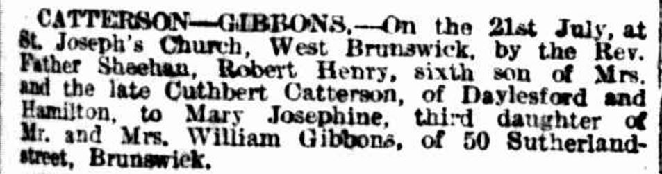 Harry had one more important duty to do before his departure overseas. On 21 July 1915, he married Mary Gibbons of Brunswick at the St Josephs Church, West Brunswick.