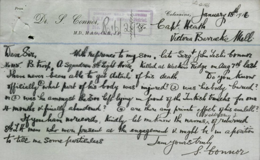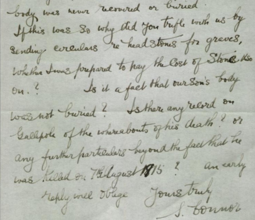Time passed, but the questions remained for Samuel Connor. In 1924, he wrote again to the Defence Department because a friend intended to travel to Gallipoli to view her son’s grave but after preliminary enquires, found there was no grave. Her son’s body was never recovered. Was that the same for my son, Samuel asked.